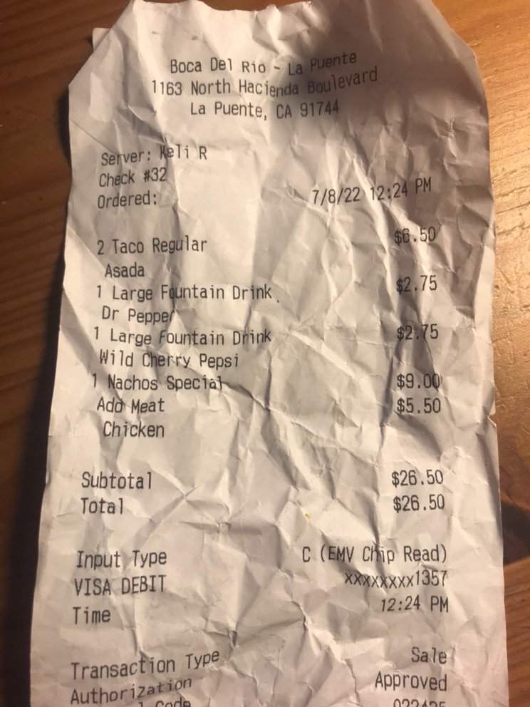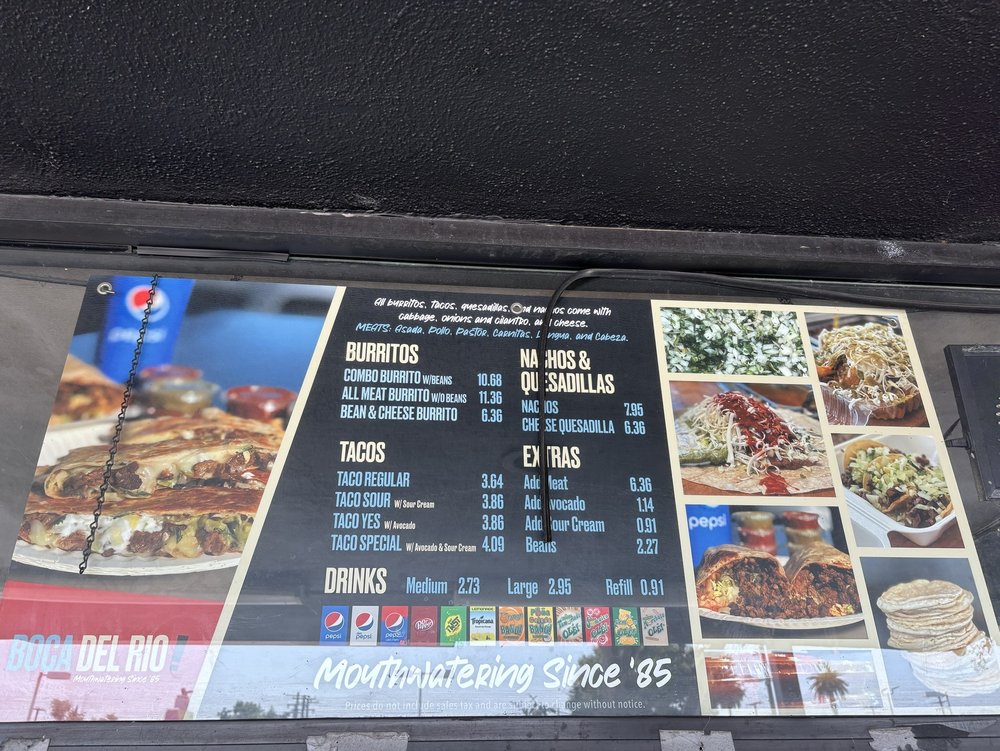 Boca Del Rio is a Mexican fast-food joint located in La Puente, CA, offering delivery, takeout, and even outdoor seating. With a range of burritos and tacos on the menu, Boca Del Rio aims to satisfy all taste buds. Try the Combo Burrito Special with beans, sour cream, and avocado for a flavorful combination, or opt for the Taco Special with avocado and sour cream for a zesty twist. The restaurant provides a casual yet classy ambiance, making it suitable for groups, kids, and even late-night cravings. With friendly waiter service and a variety of amenities like Wi-Fi and TV, Boca Del Rio ensures a pleasant dining experience. Don't forget to grab a medium or large fountain drink to complete your meal. Boca Del Rio is a go-to spot for delicious Mexican fare in the area.