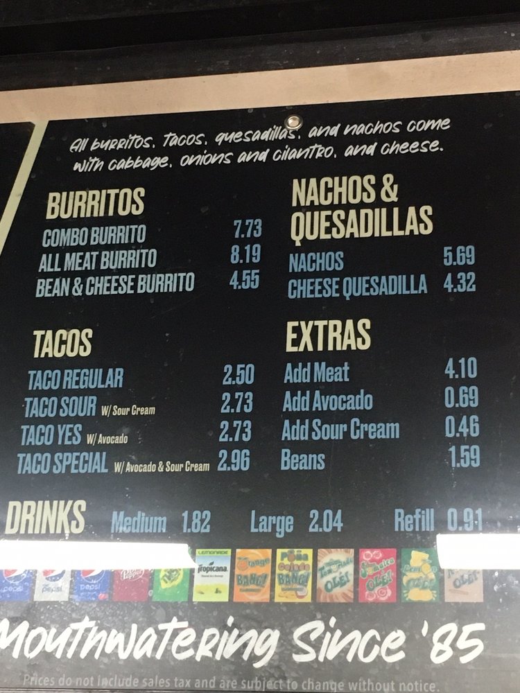w/ avocado; toppings include cabbage, onions, cilantro, & cheese.